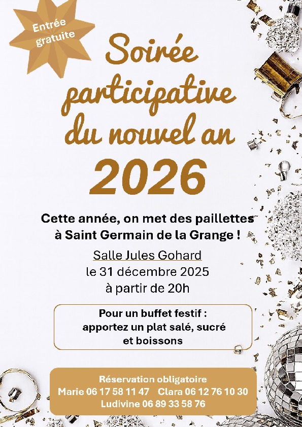 Venez célébrer le Nouvel An avec vos amis et voisins ou faites de nouvelles rencontres, à partir de 20h le 31 décembre à la salle Jules Gohard.