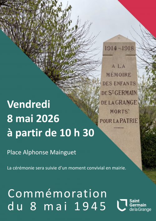 La Cérémonie commémorative de la victoire du 8 mai 1945 se tiendra au Monument aux Morts - Place Mainguet à 10h30, en partenariat avec la section locale de l'Union Nationale des Combattants (UNC).